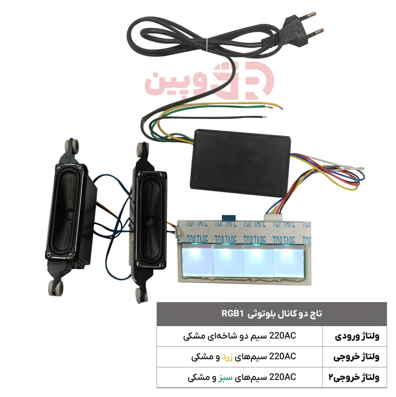 تاچ دو کانال بلوتوثی یک سنسور 220 ولت است که مناسب برای نورپردازی و آینههای بکلایت میباشد. این سنسور دارای ۲ خروجی ۲۲۰AC میباشد. از امکانات ویژه این سنسور میتوان به: پخش موزیک، کنترل موزیک ،کم و زیاد کردن صدا اشاره کرد. مدل RGB2 دارای نمایشگر میباشد که اطلاعات دما، ساعت، تاریخ، میزان صدا و سایر آیکنها را نشان میدهد.